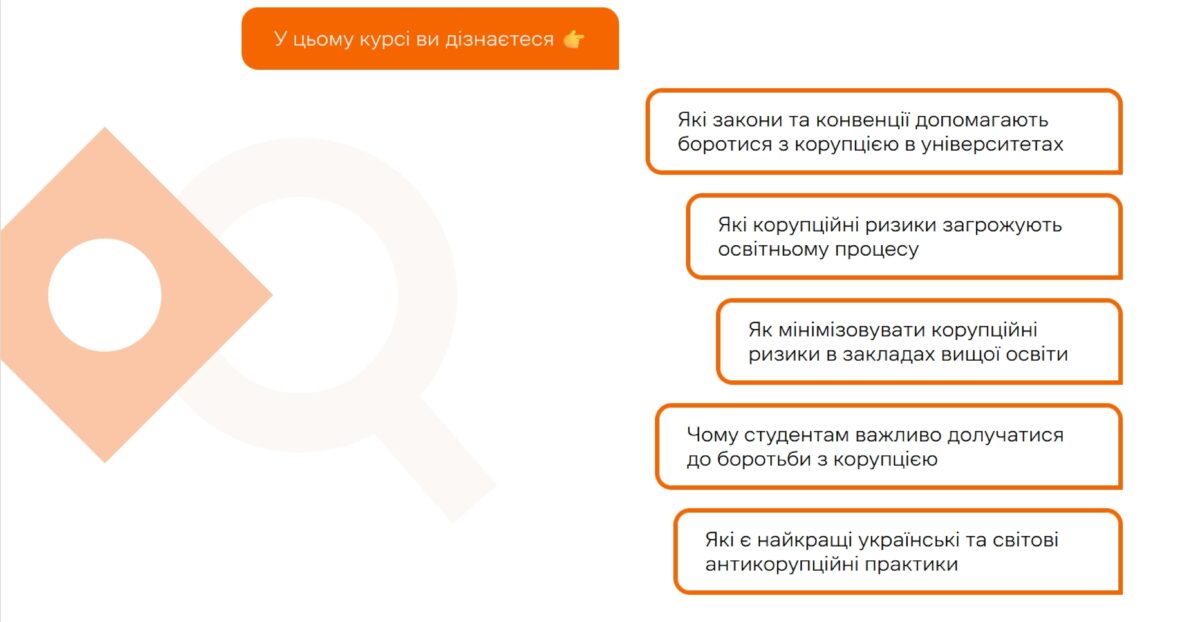 Так, в рамках вивчення курсу "Правові основи національної безпеки України" здобувачі ОПП "Правоохоронна діяльність" пройшли онлайн курс "Корупція-off: як боротися з корупційними ризиками у вищій освіті", який розроблено за ініціативи Асоціації юридичних клінік України у партнерстві зі студією онлайн-освіти EdEra. Ця публікація стала можливою завдяки підтримці американського народу через Агентство Сполучених Штатів з міжнародного розвитку (USAID). Зміст цієї публікації є виключною відповідальністю організації Асоціації юридичних клінік України і не обов’язково відображає погляди USAID чи уряду Сполучених Штатів.